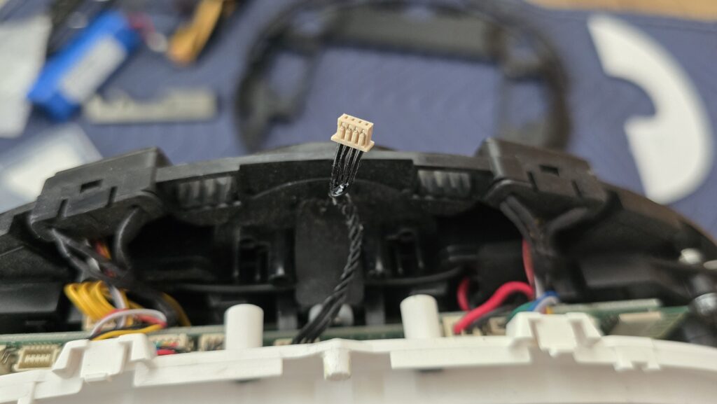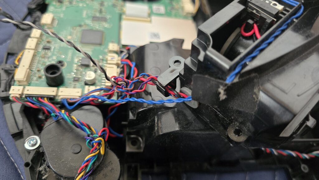 ダンパーを外すと前面からコネクター各種が見えますが、ここは3Dスキャナーから延びている配線2本を抜きます。