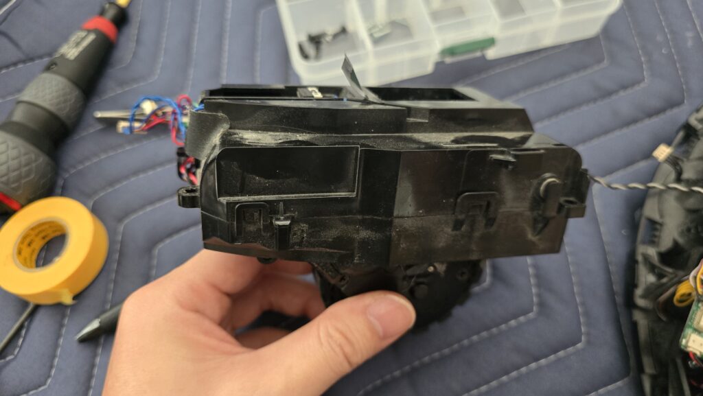 配線を抜いた後、表面の白いカバーを一気に外しますが、爪が掛かっているのか結構な力を要しました。「まだどこかネジが止まってる??」と思ったらくまなく観察して構造を理解した上でカバーを外してください。