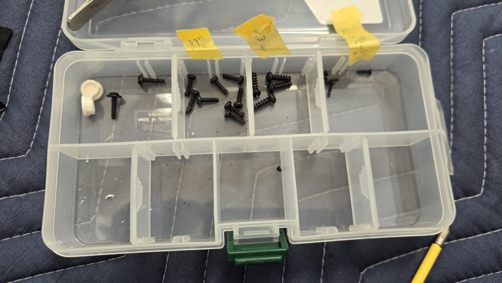 自分はミニ収納ケースをネジ入れにしてます。たった200円のコストで取り付けミスが激減するのでオススメ。